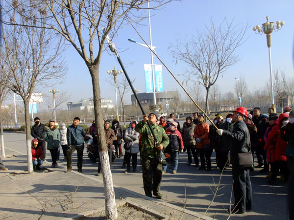 12月23日--27日,市園林局抓緊時機對園林綠化從業(yè)人員進行培訓(xùn),他們聘請了具有豐富理論和實踐經(jīng)驗的清華大學(xué)園林專業(yè)的教授,采取理論與實踐相結(jié)合的培訓(xùn)方式,系統(tǒng)講述了園林樹木修剪,養(yǎng)護以及病蟲害的防治,來自我市各縣、市、區(qū)的園林綠化專業(yè)技術(shù)人員130余人參加了此次培訓(xùn)。圖為老師在前進大街現(xiàn)場演示大樹修剪方法。